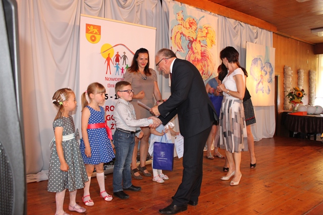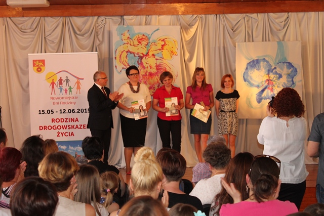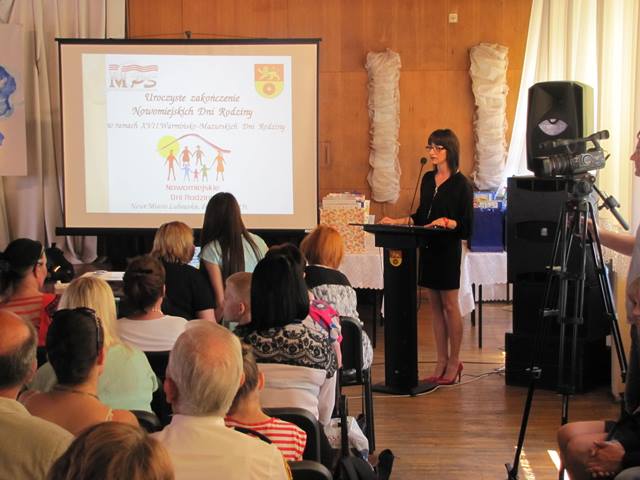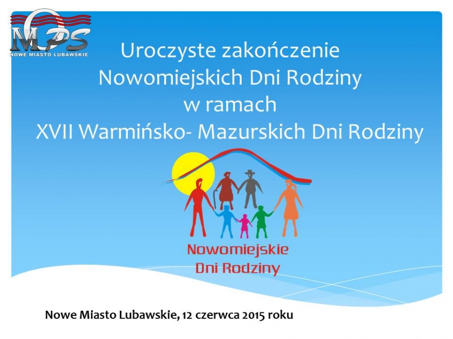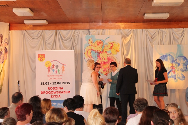 Uroczyste zakończenie podsumowujące Nowomiejskie Dni Rodziny miało miejsce 12 czerwca 2015 roku w sali widowiskowej Miejskiego Centrum Kultury w Nowym Mieście Lubawskim. Wśród licznie zebranych gości obecni byli m.in.: Burmistrz Nowego Miasta Lubawskiego- Józef Blank, Radni Miejscy, ks. dr Mirosław Gierko, dyrektorzy i kierownicy jednostek organizacyjnych gminy, Radni Młodzieżowej Rady Miasta wraz z opiekunem, uczestnicy Klubu Seniora i Młodzieżowego Klubu Integracji Społecznej działających przy Miejskim Ośrodku Pomocy Społecznej w naszym mieście oraz ponad 70 laureatów konkursów przeprowadzonych w ramach Święta Rodzin. Laureaci przybyli w towarzystwie swoich bliskich, dając poczucie rodzinnej atmosfery. Koordynator obchodów wręczył przedstawicielom zaangażowanych jednostek w tegoroczne Nowomiejskie Dni Rodziny upominki. W ramach kampanii „POSTAW NA RODZINĘ” już po raz drugi wręczone zostały certyfikaty dla 13 nauczycieli wyłonionych w plebiscycie „Nauczyciel przyjazny rodzinie”. Pedagogów rekomendowały Rady Rodziców poszczególnych szkół. Uroczystość podsumowującą obchody Nowomiejskich Dni Rodziny uświetnili swoimi występami mali artyści, tj. Pola Seroczyńska, Agnieszka Droma i Zosia Suchocka oraz grupy taneczne „REMMIC DANCE” prowadzone przez Pana Macieja Remiszewskiego.